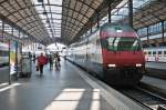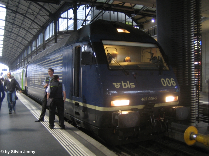 Die bls hat alle ihre SBB-Mietloks zurückgegeben, als Folge davon muss jetzt mindestens ein EW3-Pendel mit einer Re 465 bespannt werden. Am 20.6.09 war dies am RE 3335 der Fall, die Re 465 006-5 "Lauchernalp" ist soeben mit ihrem EW3-Pendel in Luzern angekommen.