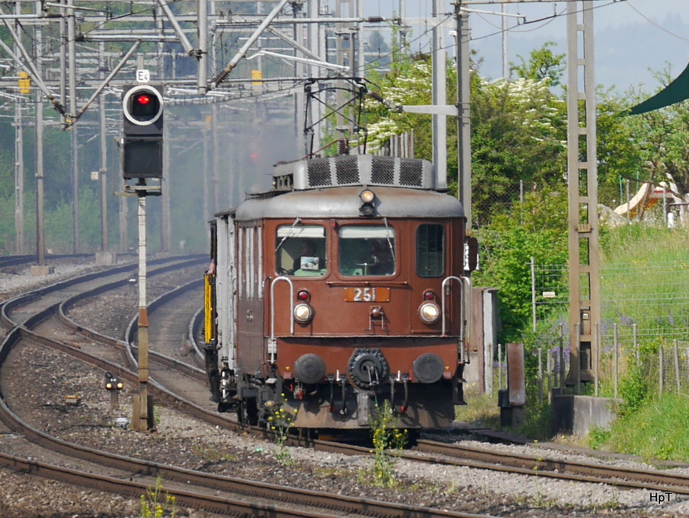 BLS Historic - Schnappschuss der Ae 4/4 251 mit Last unterwegs nach Winterthur bei der durchfahrt im Bahnhof Rupperswil am 25.04.2014