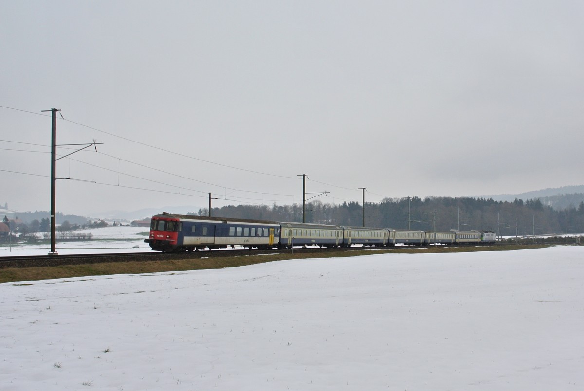 Noch immer verkehrt der BLS Reserve EWI Pendel in EWIII Umläufen. Heute fuhr er seit einiger Zeit zum ersten mal wieder auf den RE Bern-Luzern, vorher verkehrte er fast ausschliesslich zwischen Bern und Neuchatel. Im Bild ist der Pendel mit dem führendem BDt EWII 50 63 82-33 911-3 (ex. SBB) und der schiebenden Re 420 502-7 (ex. SBB 11117) als RE 4372 kurz Worb SBB, 18.02.2015.