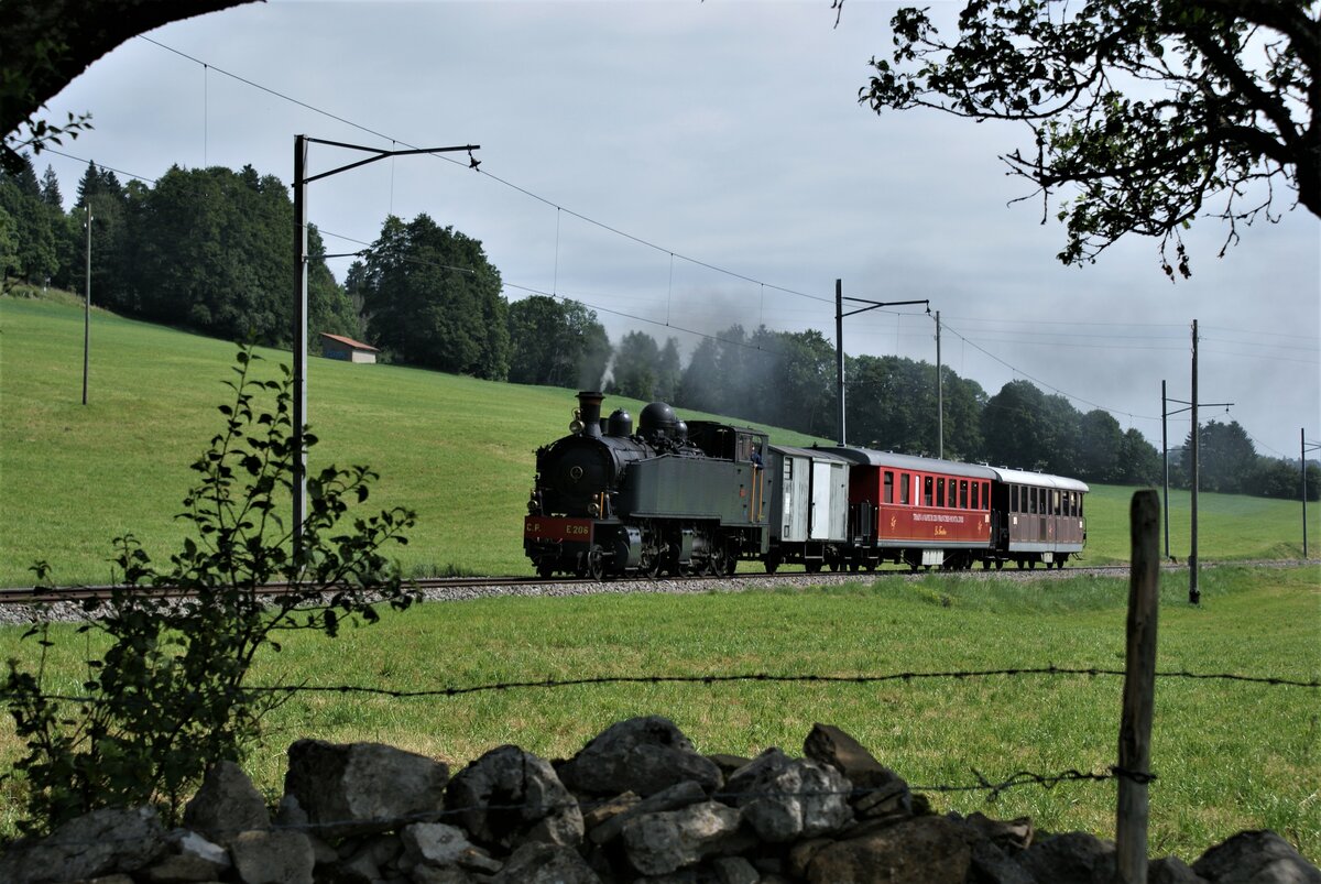 La Traction CJ La Traction train à vapeur des Franches-Montagnes Chemins de fer du Jura: E 206 + BR 779 + WR 777 + J 316, Zug Pré-Petitjean-Tavannes (nach Fahrtrichtungswechsel in Le Noirmont), Milieu des Prés Les Reussilles, 15. August 2021.