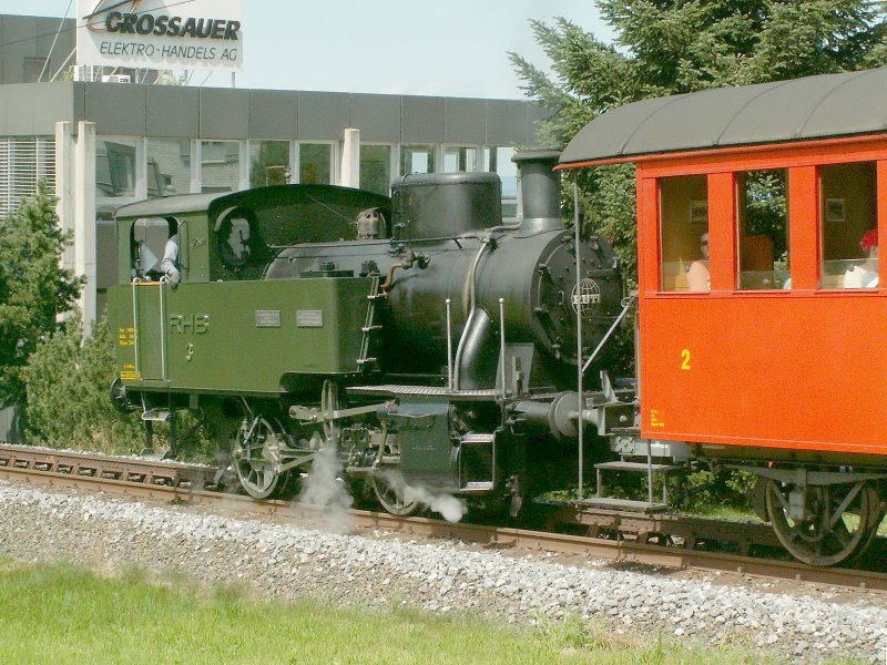 Denkmallok H 2/2 2 "Elfe" am 24. August 2018 in Ostermundigen. Die Lok war zwischen 1876 und der Betriebseinstellung 1902 auf der Steinbruchbahn Ostermundigen, der ersten Zahnradbahn Europas, im Einsatz.