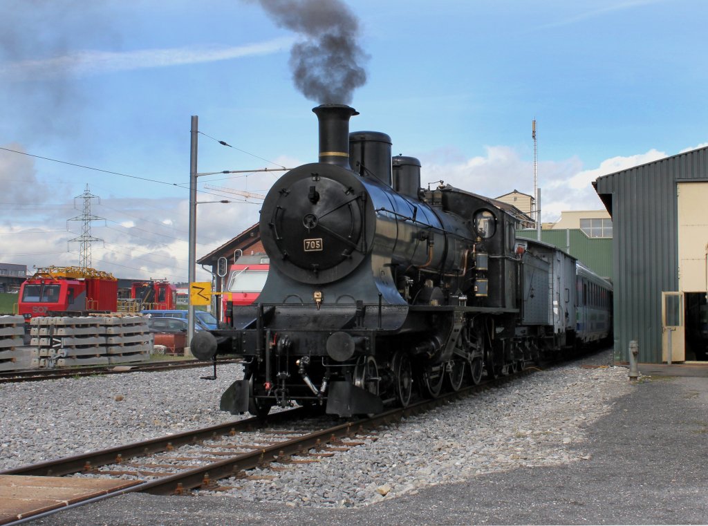Die Huttwiler Dampftage bringen viel Verkehr auf die Strecke bei Sumiswald. Hier zieht am 04.10.2025 die A 3/5 705 von SBB-Historic einen Zug mit recht modernen Wagen Richtung Ramsei. Arthur Beusch