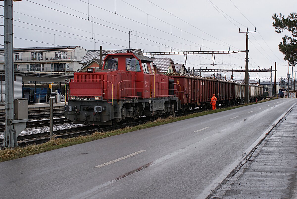 Schweizer Zucker AG, Zuckerfabrik Aarberg, Kampagne 2025: Am 841 030-0 (LPAG, LokPool AG, CH 8500 Frauenfeld), Aarberg, 8. Januar 2026. Die Kampagne 2025 des Werkes Aarberg dauerte 141 Tage, vom 22. September 2025 bis 11. Februar 2026, verarbeitet wurden 992'302 t (Quelle: Schweizer Zucker AG, Wochenberichte). "Rechenspiele" zur Kampagne des Werkes Aarberg: Anteil der Bahnanfuhr 51 1/3 Prozent, Bahnanfuhr von Rüben je Kampagnetag 3613 t (Reingewicht) oder 3927 t (ohne Abzug), verarbeitete Rüben je Kampagnestunde 293,2 t. Das Werk Frauenfeld verarbeitete auch Biorüben und Rüben aus Deutschland: Anteil der Biorüben 5,1 Prozent und der Importrüben 19 Prozent an der Gesamtmenge der in Frauenfeld und Aarberg verarbeiteten Rüben. Der durchschnittliche Zuckergehalt der Rüben erreichte 15,7 Prozent. Gute Erträge und der Ausfall des Kalkofens im Werk Frauenfeld haben die Kampagne 2025 bis in den Februar 2026 verlängert. Gewöhnlich enden die Kampagnen jeweilen um die Festtage und den Jahreswechsel. Gerd Weber