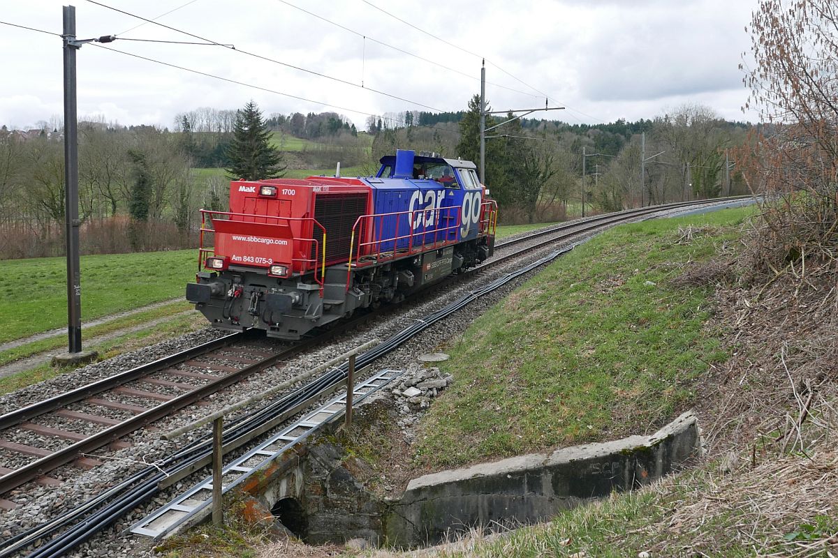Während sich das Lama für den Fotograf interessiert, hat dieser Am 843 092-8 im Blick, die mit einem Schiebewandwagenzug Bischofszell Nord in Richtung Sulgen verlässt (03.10.2022)