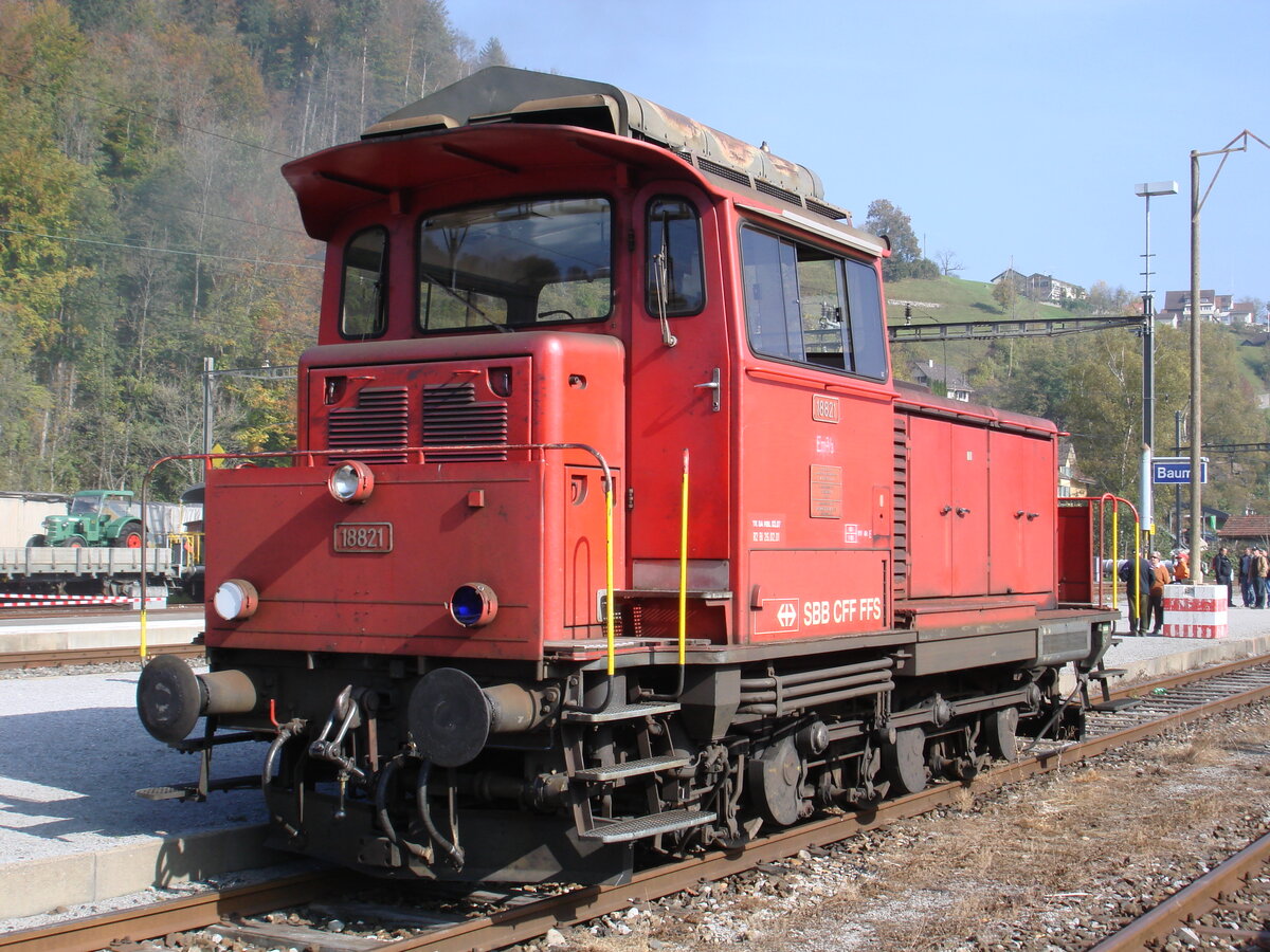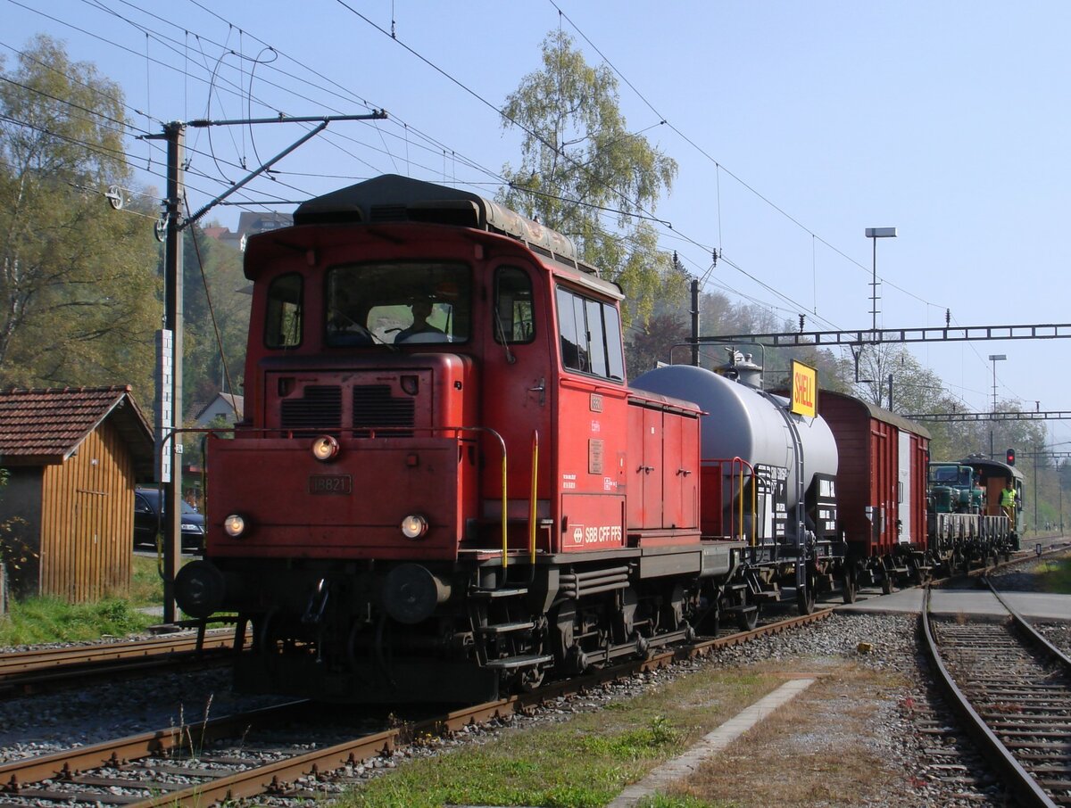 Die SBB-Em 3/3 18821 fährt am 14. Oktober 2007 anlässlich des DVZO-Fahrzeugtreffens mit einem historischen Güterzug in Bauma ein. Der Fotostandort auf dem Perron war an diesem Wochenende gegen die Gleise zusätzlich mit einem Absperrband gesichert.