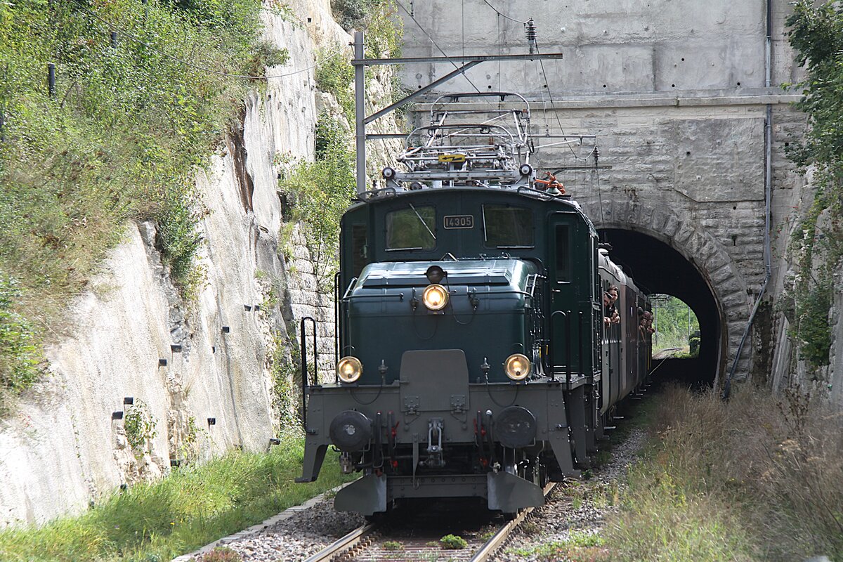 Am 17.09.2023 verlässt das Krokodil von SBB Historic auf einer Sonderfahrt Richtung Olten den kurzen Tunnel bei Buckten.