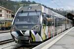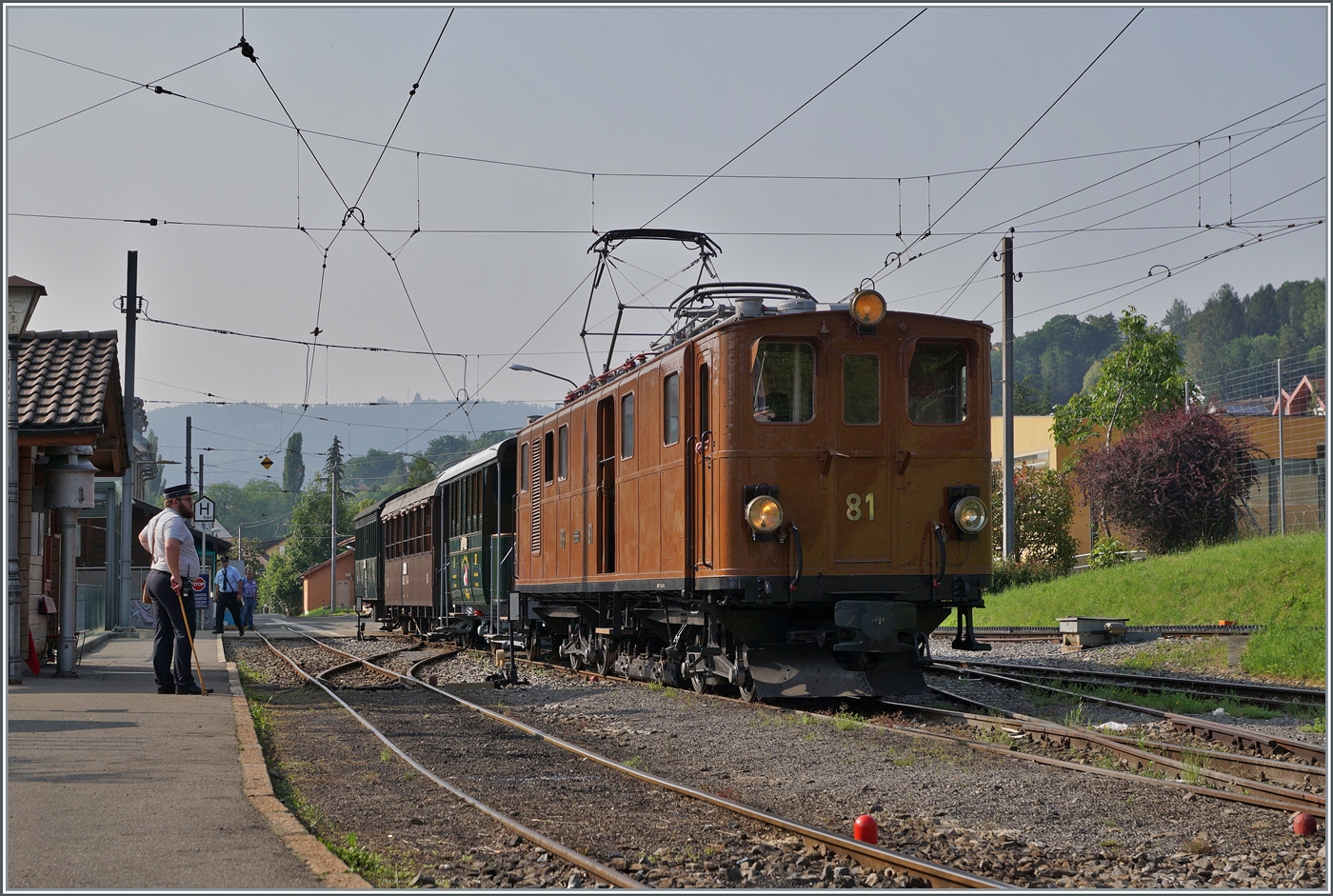 La DER de la Saison / Das Saison Ende der Blonay Chamby Bahn 2024 - Seit einigen Jahren zeigt die Blonay Chamby Bahn zum Saison Ende mit einem verdichteten Fahrplan noch einmal ihre herrlichen Fahrzeuge im Einsatz. Die herrliche RhB Bernina Bahn Ge 4/4 81 der Blonay-Chamby Bahn verlässt Blonay mit einen stimmigen zusammengesetzten Reisezug in Richtung Chaulin.
