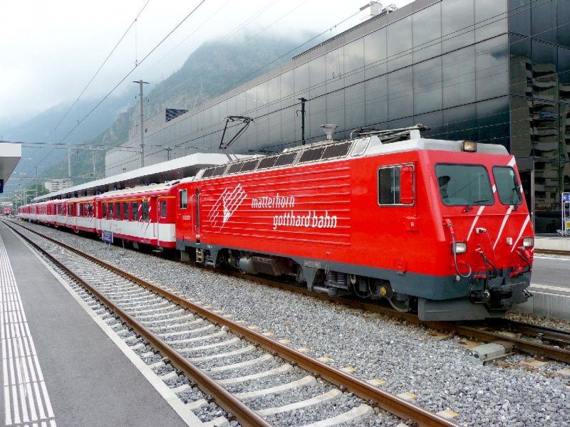 MGB - Zahnrad E-Lok HGe 4/4 1 vor einem Regio im Bahnhof von Visp am 01.09.2008