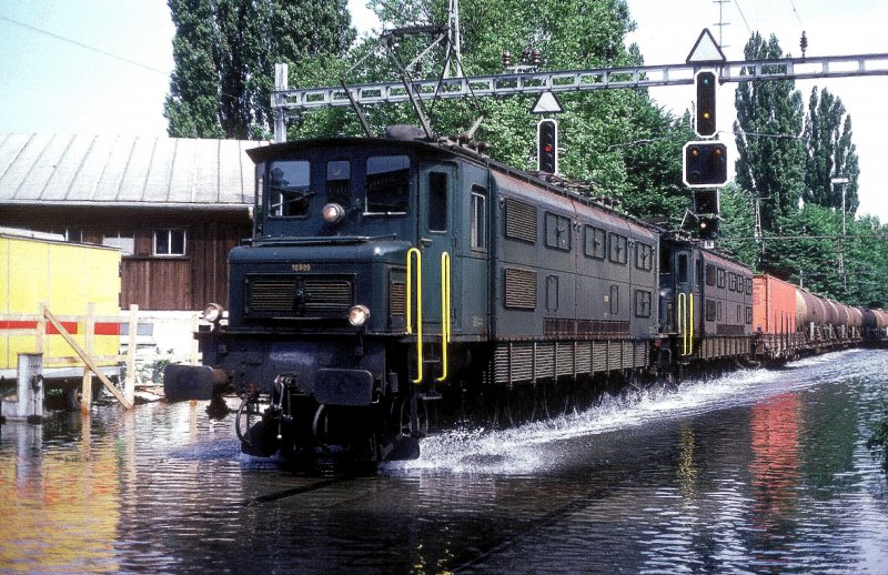 460 015-1 SBB mit Zug 53728 Basel RB - Lausanne Triage bei Twann am 14.04.1993. Zwei Oldtimer Ae4/7, Nr 10944 und 11009, wurden mitgeführt. Scan 6289.