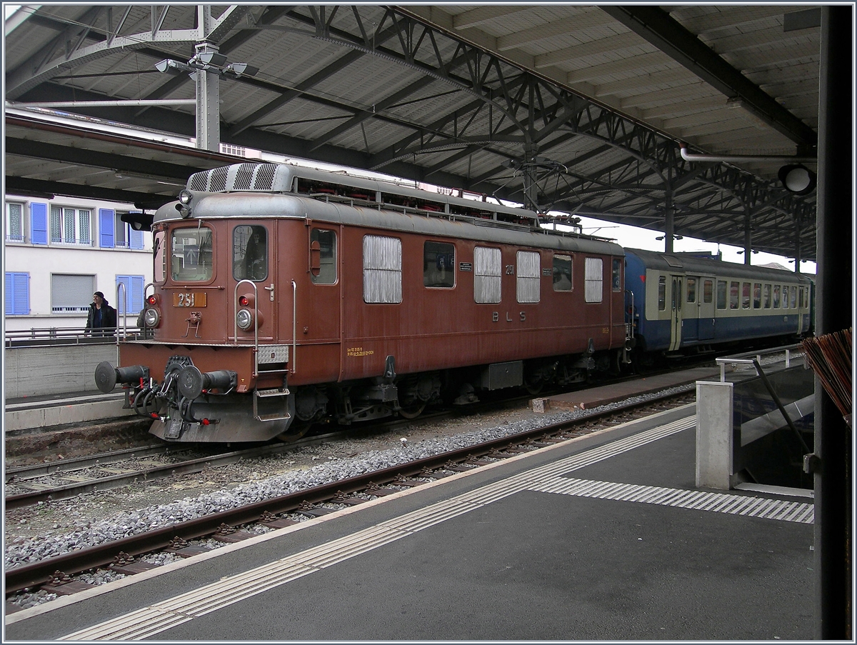 Die schöne BLS Ae 4/4 251 vor passendem Wagenmaterial des Weihnacht-Markt Zugs in Lausanne.