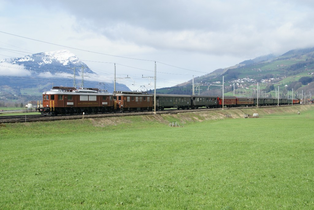 Majestätisch grüsst die Königin der Berge den Nostalgie-Rhein-Express, der am 27.3.10, gezogen von den BLS-Veteranen Ae 6/8 205 und Ae 4/4 251, Steinen hinter sich zurücklässt.