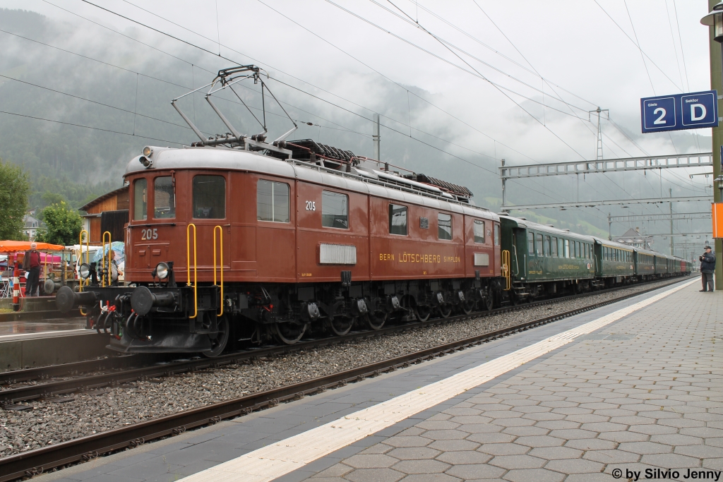 Die vom historischen Erbe der bls liebevoll gepflegte mayestätische Ae 6/8 205 am 29.6.2013 in Frutigen.