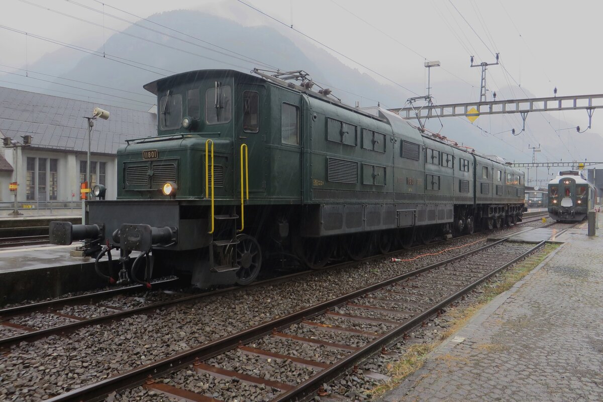 Die Gotthard-Lok Ae 8/14 11801 wurde anläßlich des Tages der offenen Tür zum 175-jährigen Jubiläum der Schweizer Bahnen in Erstfeld richtig gefordert. Sie pendelte mit einem Reisezugwagen zwischen dem Bahnhof Erstfeld und der Lokhalle von SBB Historic in Erstfeld im Wechsel mit dem Triebwagen BDe 4/4 1646.