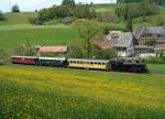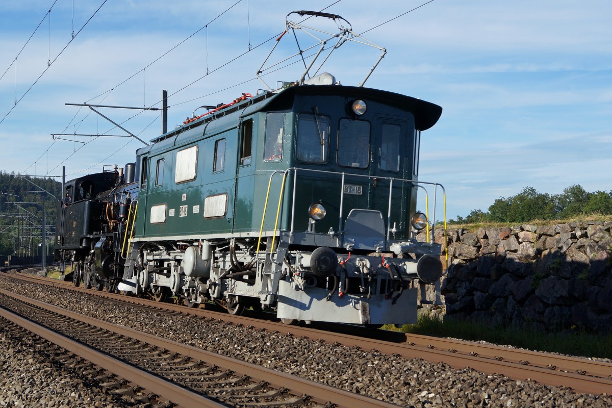 BDWM/DVZO/DBB: Ueber das Wochenende vom 26. bis 28. Juni 2015 verabschiedete sich die BDWM nach 140 Jahren vom Anschluss an das Europäische Normalspurnetz, weil durch die Aufhebung des Güterverkehrs auf normaler und schmaler Spur das Dreischienengeleise zwischen Wohlen und Bremgarten West nutzlos geworden ist. Mit dem WESCHTFÄSCHT und vielen Sonderfahrten nahmen Schüler und eine grosse Anzahl Festbesucher Abschied vom Dreischienengeleise auf diesem reizenden Streckenabschnitt. Am 28. Juni 2015 brachte die DVZO Be 4/4 15, ehemals BT die DBB Eb 3/5 5810 "HABERSACK", ehemals SBB von Wohlen nach Konolfingen zur DBB zurück. Die Aufnahme entstand bei Roggwil im sommerlichen Abendlicht.