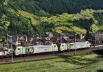 Eine Re 10/10 mit offenen Güterwagen überfährt am 7. September 2016 die Mittlere Meienreussbrücke nordwärts, also Richtung Tessin.