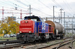 Re 10/10, mit den Loks 11329 und 620 086-9, durchfahren den Bahnhof Pratteln. Die Aufnahme stammt vom 28.10.2016.