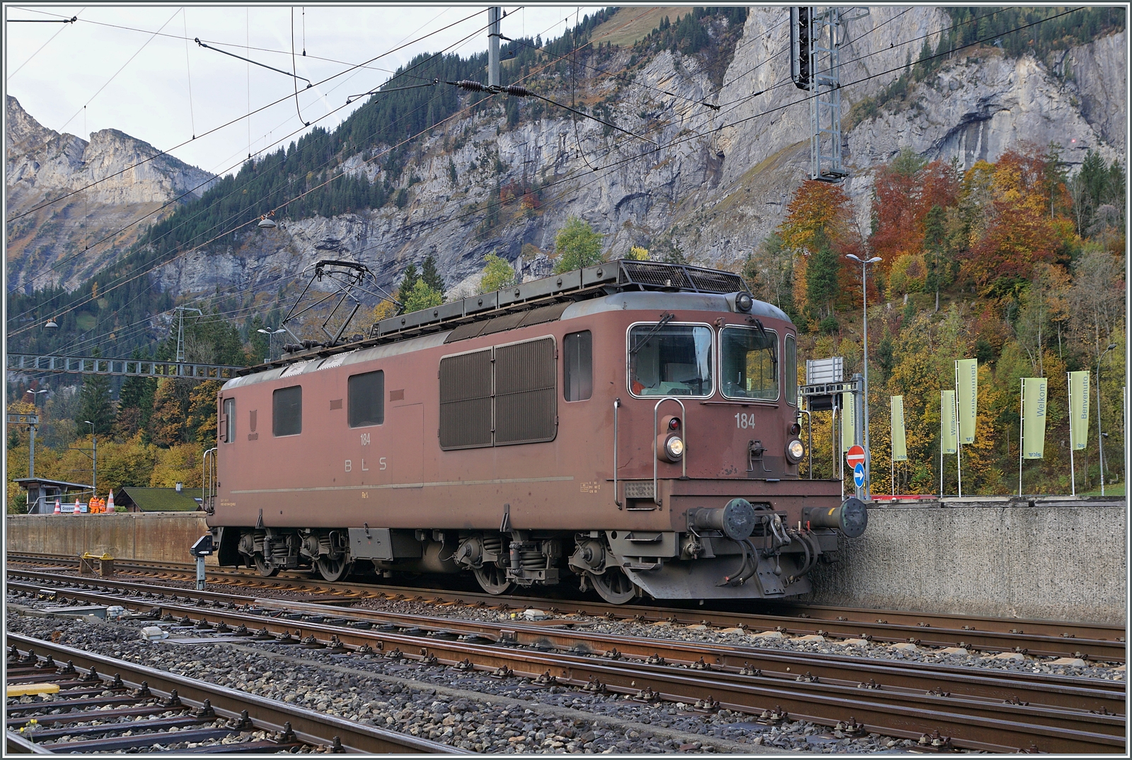 Die BLS Re 4/4 184 hat viel von ihrem alten Glanz verloren, doch ihrem Scherenstromabnehmer hat die Lok weiterhin ihren Charm behalten. Die Lok rangiert in Kandersteg.
