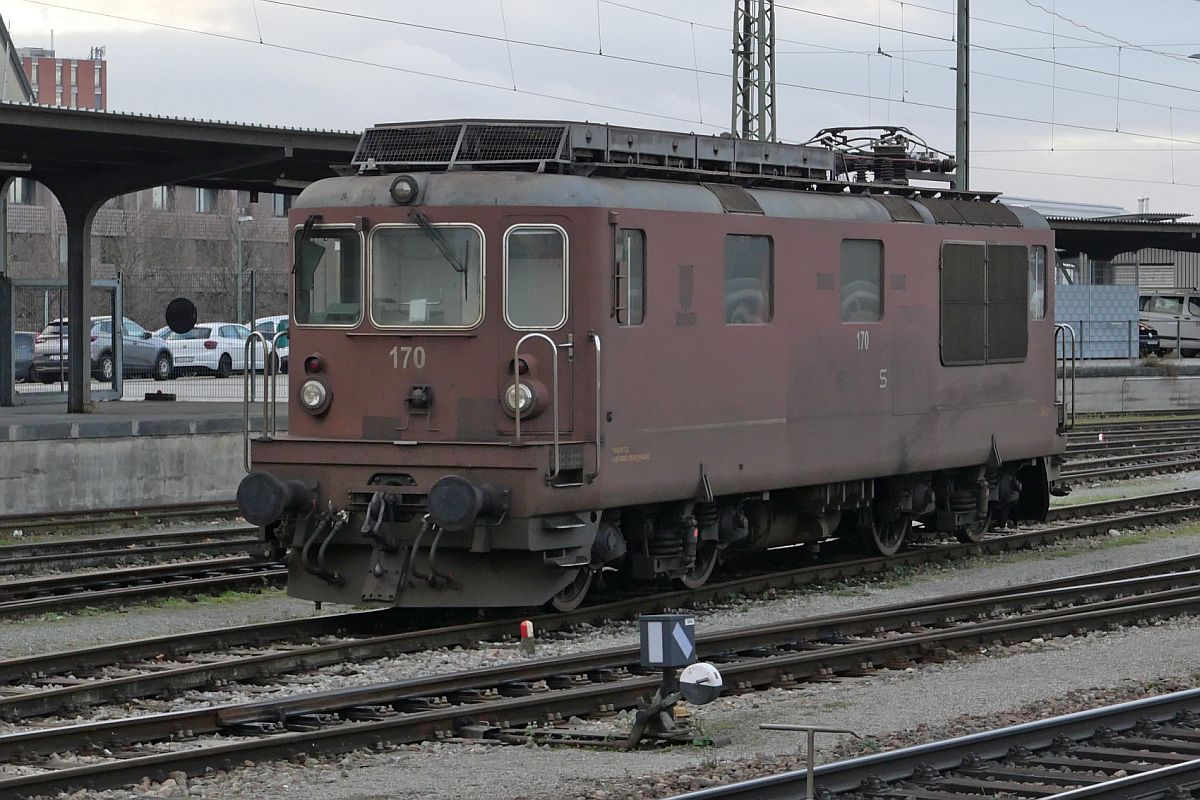 Re 4/4 170 der BLS ohne ihr Wappen von 'Brig-Glis' und zwei fehlenden Buchstaben des BLS-Schriftzuges am 04.02.2023 in Basel bad Bf
