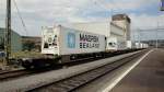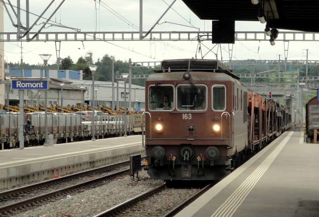 Die BLS Re 4/4 163 "Grenchen" durchfährt am 14.07.11 mit einem leeren Autozug den Bahnhof Romont.