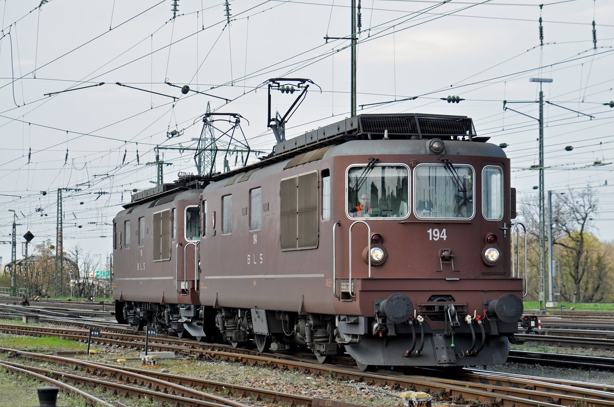 Doppeltraktion mit den BLS Lok's 194 und 181, werden beim Badischen Bahnhof abgestellt. Die Aufnahme stammt vom 04.04.2016.