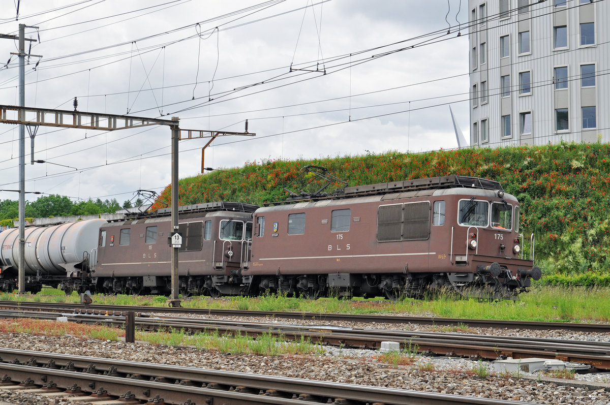 Doppeltraktion mit den BLS Loks 175 und 185, durchfahren den Bahnhof Pratteln. Die Aufnahme stammt vom 24.05.2016.