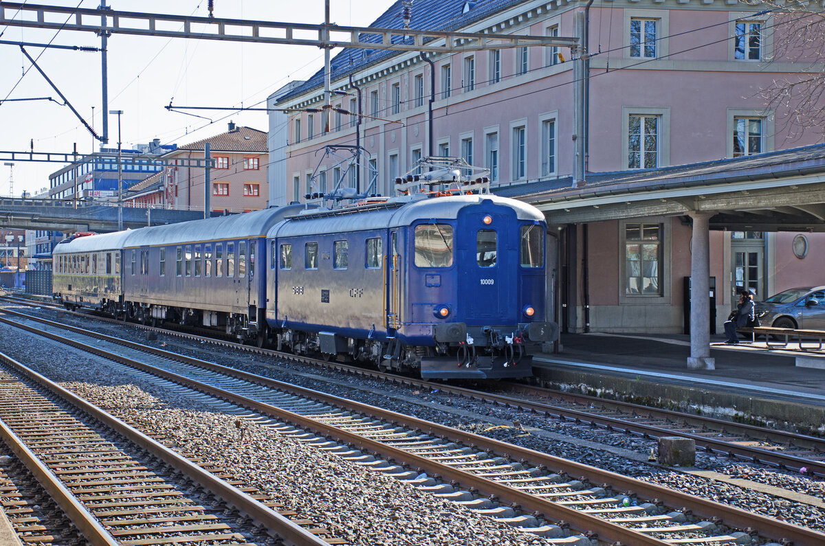 Freitag den 13.03.2026 um 10:29 Uhr in Schlieren (CH). ZRT Reise von Winterthur (ZH) nach Bulle (FR) über Zürich HB (Tief 32) – Schlieren – Baden – Aarau – Olten – Burgdorf – Hasle-Rüegsau - Konolfingen – Bern – Fribourg – Romont. Zugkomposition: Re 4/4 I 10009 (UIC 91 85 4410 009-5 CH-CLRA), Schützengarten-Wagen von Suisse Train Blue (UIC 56 80 8980 010-2 D-IRSI WGm), Dining-Car No1072 - Prestige Continental Express - Le Rubis Noir - Voiture Salon-Restaurant 1072 (61 85 8895 515-2 CH-IRSI Armz 211). Der Zug hat folgende Zugnummern: Winterthur bis Burgdorf 31430, Burgdorf bis Bulle 31432 (wegen Routenänderung). Hier im Bahnhof Schlieren auf Gleis 1 angelangt wird ein Fotohalt gemacht (von 10:27 bis 10:46 Uhr). Koordinaten GMS (Grad, Minuten, Sekunden): N 47° 23’ 57.4’’ O 8° 26’ 48.8’’