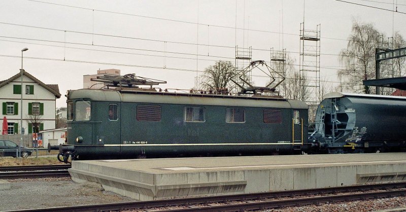 Re 416 628-6 (ex Re 4/4 I SBB, MThB, Thurbo) mit zwei Güterwagen am 26.02.09 bei der Ausfahrt im Bahnhof Kreuzlingen