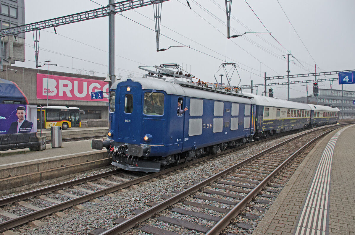 Donnerstag den 04.12.2025 um 10:34 Uhr in Brugg (AG). Aus dem Nebel auftauchender ZRT (https://www.zrt.ch/de) Extrazug nach Porrentruy. Zugnummer: 31460. Strecke: Winterthur (ab 09:18 Uhr) - Zürich HB - Brugg AG (an/ab 10:35/44 Uhr) – Frick – Münchenstein - Delémont - Porrentruy (an 13:33 Uhr). Lokomotive Re 4/4I 10009, UIC-Nr. 91 85 4410 009-5 CH-CLRA (https://www.dampflok.ch/index.php/news/16-news/aktuell/734-auffrischung-re-4-4-i-409-sommer-2024). Lokomotivführer ist R. S. welcher die alten gestreiften Arbeitskleider trägt. 1. Wagen: ARmz 61 85 8890 200-6 CH-IRSI (Voiture Salon - Restaurant No. 1071) mit der Anschrift  Le Salon Bleu“. Es ist ein Wagen des  Prestige Continental Express“ (Croisières Ferroviaires Européennes). 2. Wagen: WRm 61 85 8894 003-0 CH-IRSI (Piano-Bar No. 1073) mit der Anschrift  Le Diamant Bar“. Es ist ein Wagen des  Prestige Continental Express“ (Croisières Ferroviaires Européennes). Elegant und stilvoll unterwegs (https://www.prestige-continental-express.ch). Das Essen gibt es frisch zubereitet aus der Speisewagenküche an den Platz (nennt sich Esskultur). Koordinaten GMS (Grad, Minuten, Sekunden): N 47° 28’ 54.1’’ O 8° 12’ 36.0’’