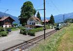 Die BLS Re 4/4 II 504 ist kurz vor Spiez mit ihrem RE von Interlaken Ost nach Zweisimmen unterwegs.