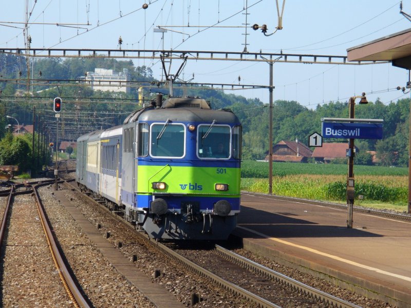 bls / Re 4/4 420 501-9 mit dem Regionalzug nach Büren an der Aare bei der Einfahrt in den Bahnhof von Busswil am 15.07.2007