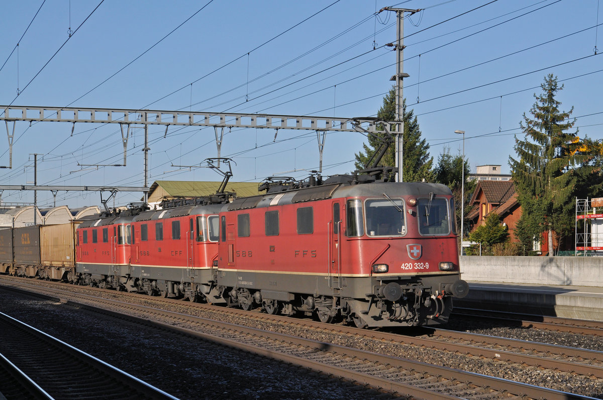 Dreifach Traktion, mit den Loks 420 332-9, 420 328-7 und 420 341-0, durchfahren den Bahnhof Rothrist. Die Aufnahme stammt vom 11.03.2017.
