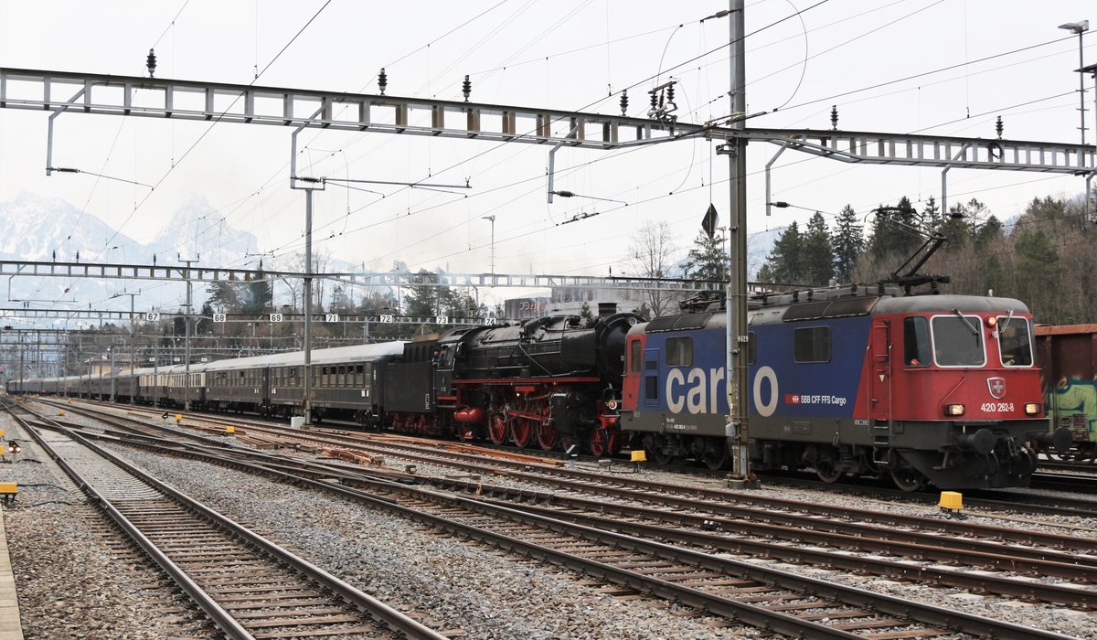 Die SBB Re 420 262-8 wurde für die Fahrt von Erstfeld nach Arth-Goldau vor dem langen Dampfzug und der 01 202 gespannt.