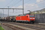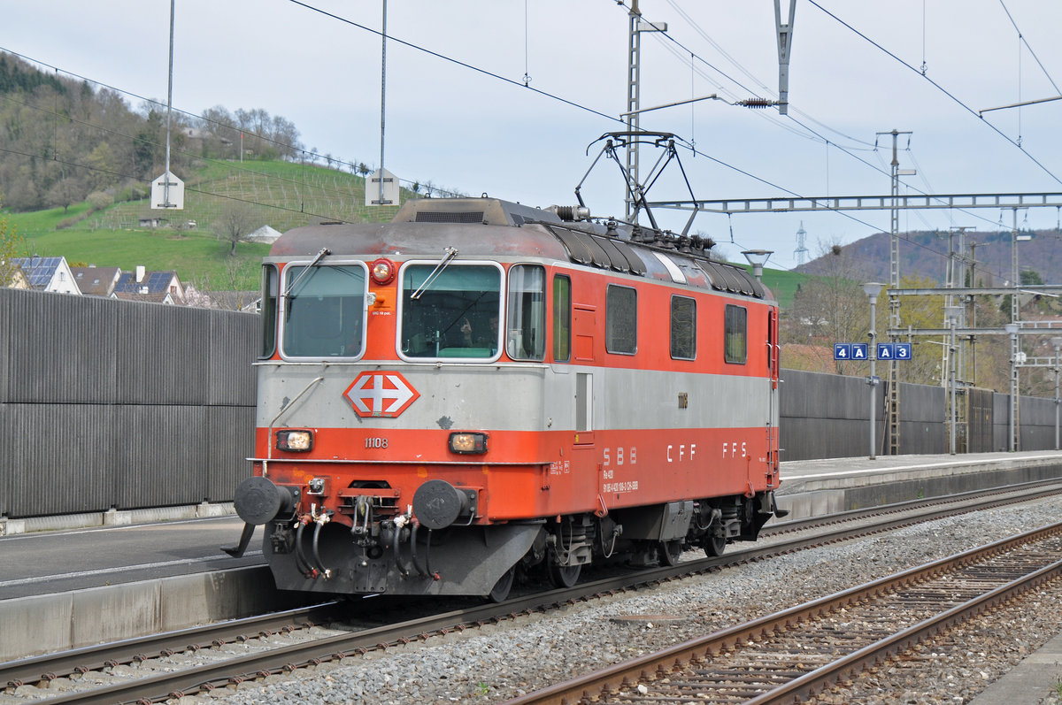 Re 4/4 II 11108 durchfährt den Bahnhof Gelterkinden. Die Aufnahme stammt vom 14.04.2018.
