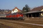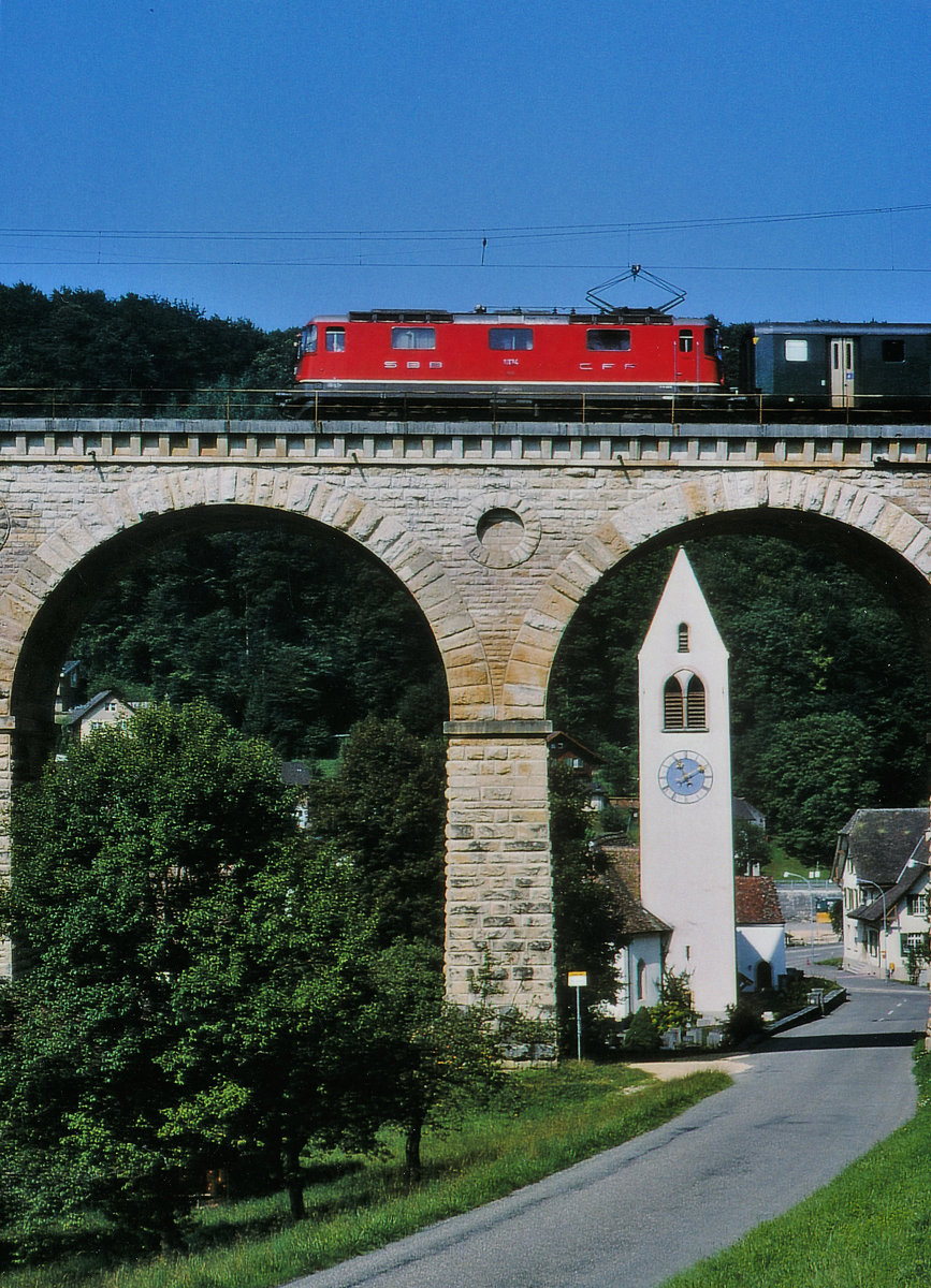 SBB: Nicht erkennbare Re 4/4 II mit Viadukt und Kirche von Rümlingen im Mai 1994.