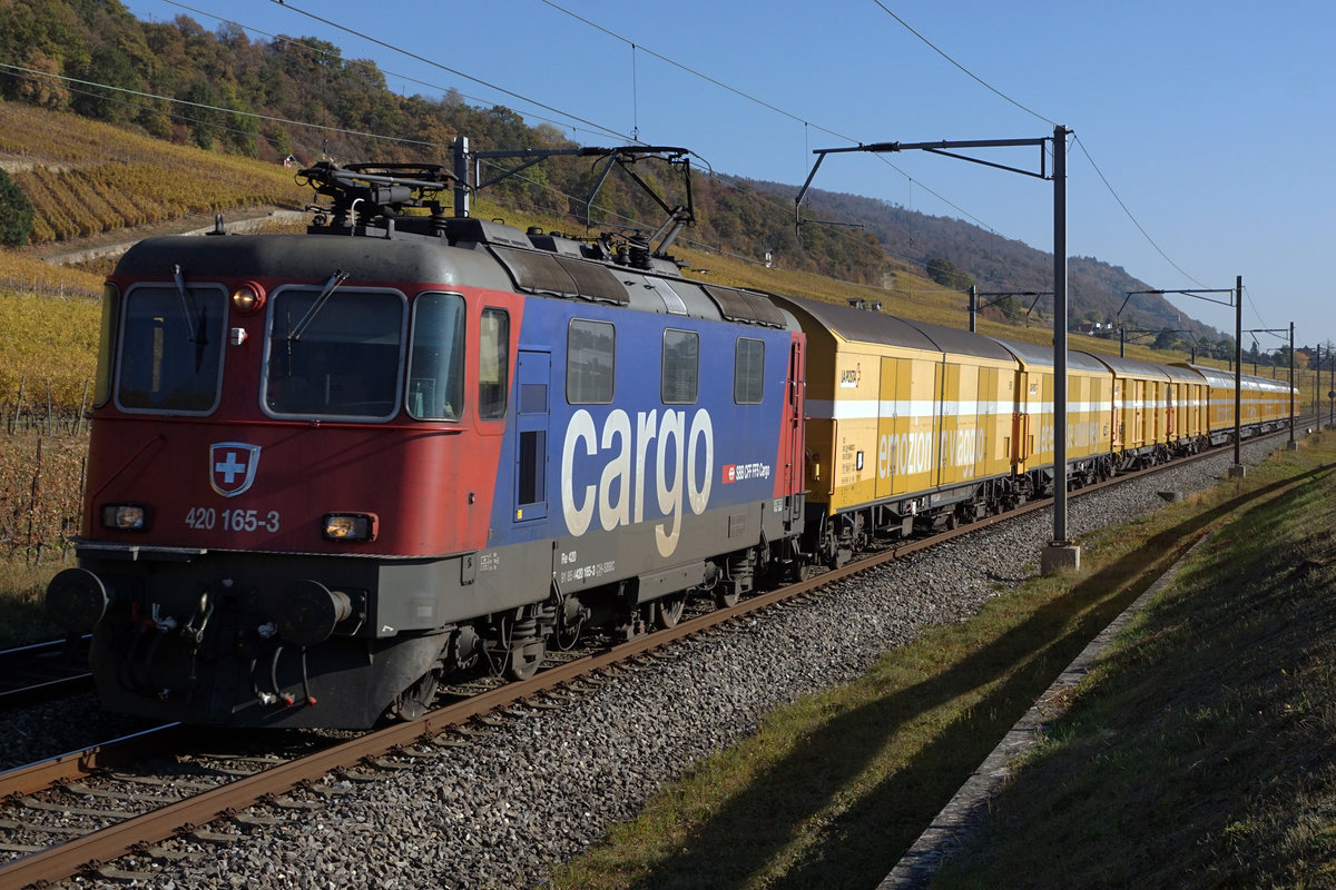 Re 420 165-3 mit einem Postzug bei Cressier am 22. Oktober 2018.