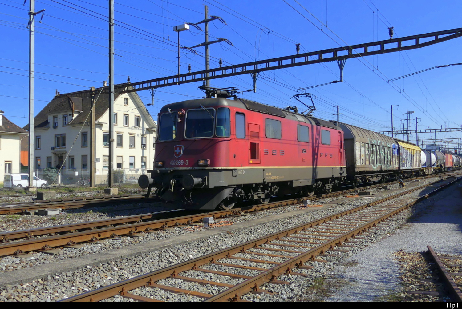 Für die Re 420 162-0 hat bald die letzte Stunde geschlagen. Am 06.03.2026 steht die Lok auf einem Abstellgleis beim Bahnhof Kaiseraugst.