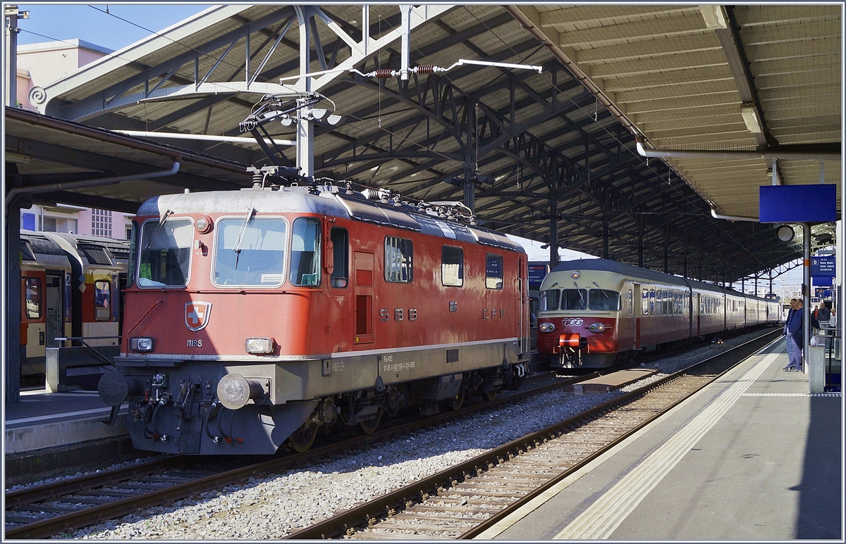 In Lausanne wird dem TEE 1053 die SBB Re 4/4 II 11198 vorgespannt, die Re 4/4 11198 verkehrte nicht nur etliche Jahre am Gotthard, sie besass auch lange Jahre einen ÖBB/DB Stromabnehmer für den Verkehr nach Lindau.