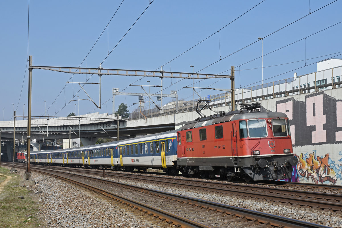 Re 4/4 II 11157 fährt Richtung Bahnhof Muttenz. Die Aufnahme stammt vom 24.03.2019.