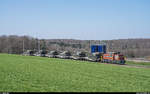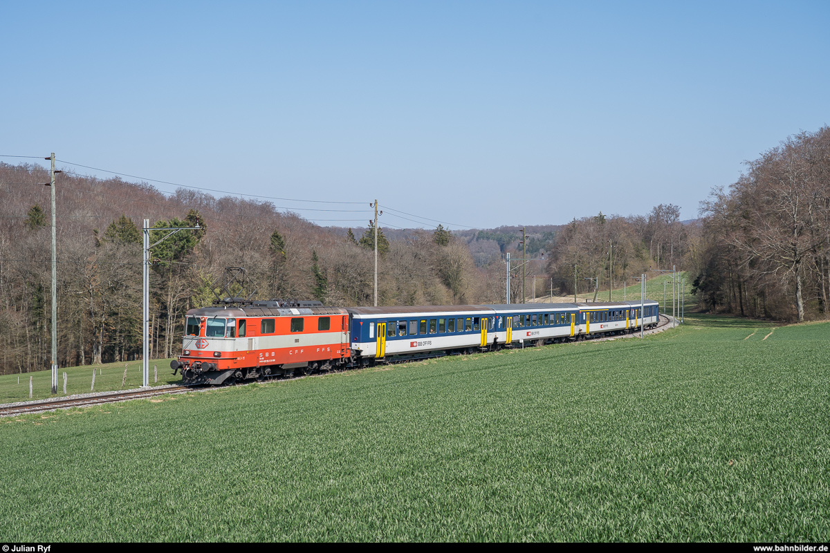 Re 4/4 II 11108 bringt am 29. März 2019 einen Extrazug für Militärangehörige, bestehend aus einem HVZ-Pendel der Regio-S-Bahn Basel, von Basel nach Bure. Hier zu sehen auf der ausschliesslich Militärtransporten dienenden Strecke Courtemaîche - Bure.