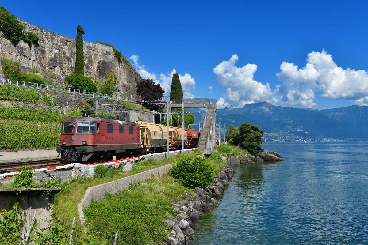 Re 420 242 mit einem Güterzug am 22.06.2016 bei Rivaz.