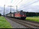 Re 420 264-4 arbeitet sich am 22.10.2020 mit dem Kieszug nach Bodio in Wassen zusammen mit Re 6/6 11685 "Sulgen" die Gotthard-Nordrampe hinauf und wird in wenigen Sekunden in den Wattinger Kehrtunnel einfahren.