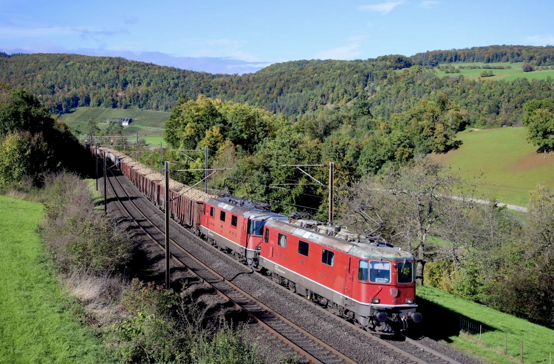 SBB Re 420 299 & 303 / Courtelary, 16. Mai 2025<br>Transrail Aushubzug Le Locle Col-des-Roches - Reuchenette-Péry