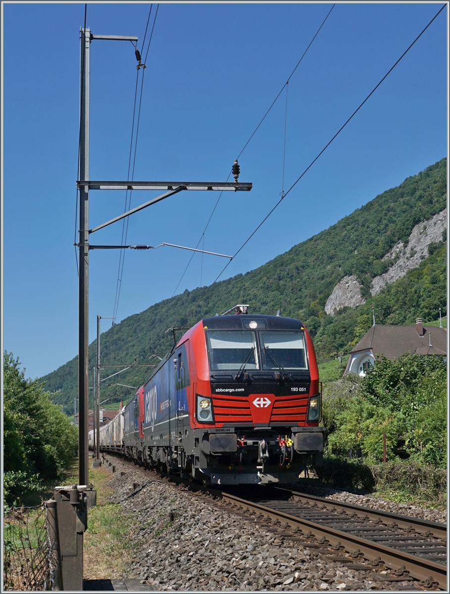 Vor dem Hintergrund bunter Blätter und teilweise auch von solchen verdeckt ist die an SBB Cargo vermietet 193 063 mit einem Güterzug kurz nach Villeneuve auf dem Weg in Richtung Lausanne.