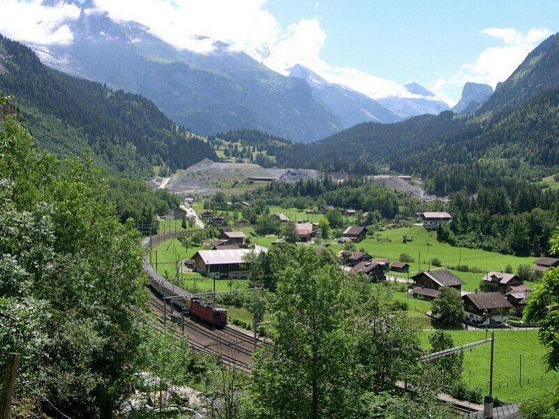 Berner Oberland 2007 - Planmäßig mit einer Cisalpino-garnitur gefahren wird der IC 873 Basel - Brig. Hier ist der Zug am 25.07.2007 an der Lötschberg-Nordrampe unterwegs in Richtung Süden. Gleich durchfährt er den Bahnhof Blausee-Mitholz, unterquert die Felsenburg in einem Tunnel, und erscheint gute 3 bis 4 min direkt links neben uns nocheinmal. Allerdings jetzt auf fast gleicher Höhe und in entgegengesetzter Fahrtrichtung. Wir stehen hier nahe der Felsenburg und blicken in Richtung Kandersteg. im Hintergrund ist noch das Baufeld des Zwischenangriffs Mitholz für den Lötschberg-Basistunnel zu erkennen. Man hat bereits mit Rekultivierungsarbeiten begonnen.