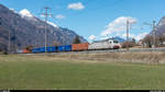 Donnerstag den 05.01.2023 Uhr um 14:16 Uhr. Nördlich vom Bahnhof Castione-Arbedo bei der Linkskurve (in nördlicher Richtung gesehen) auf der Seite des Einkaufszentrums gibt es den Gehsteig welcher eine kleine Stützmauer besitzt. Auf dieser Mauer kann man stehen und erreicht somit eine Höhe dass die vorbeikommenden Autos die Sicht zum Bahndamm nicht behindern. Vom Norden kommt die Re 4/4 II (Re 420) mit der Fahrzeugnummer 91 85 4420 294-1 CH-SBBC mit der Jubiläumsbemalung „100 Jahre Schweizer National Zirkus Knie“ (1919 – 2019) und dem Wappen von St. Gallen da sich der Heimatort des Zirkus Knie in Rapperswil (SG) befindet. Am Zughacken hat er zwei Postwagen angehängt.