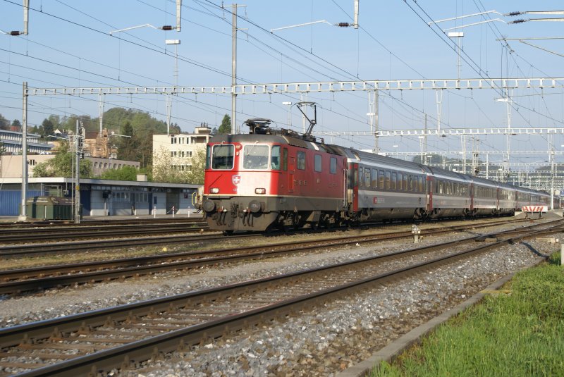 Re 4/4 II 11219 mit dem IR 759 am 27.4.08 bei der Ausfahrt aus Pfäffikon SZ.