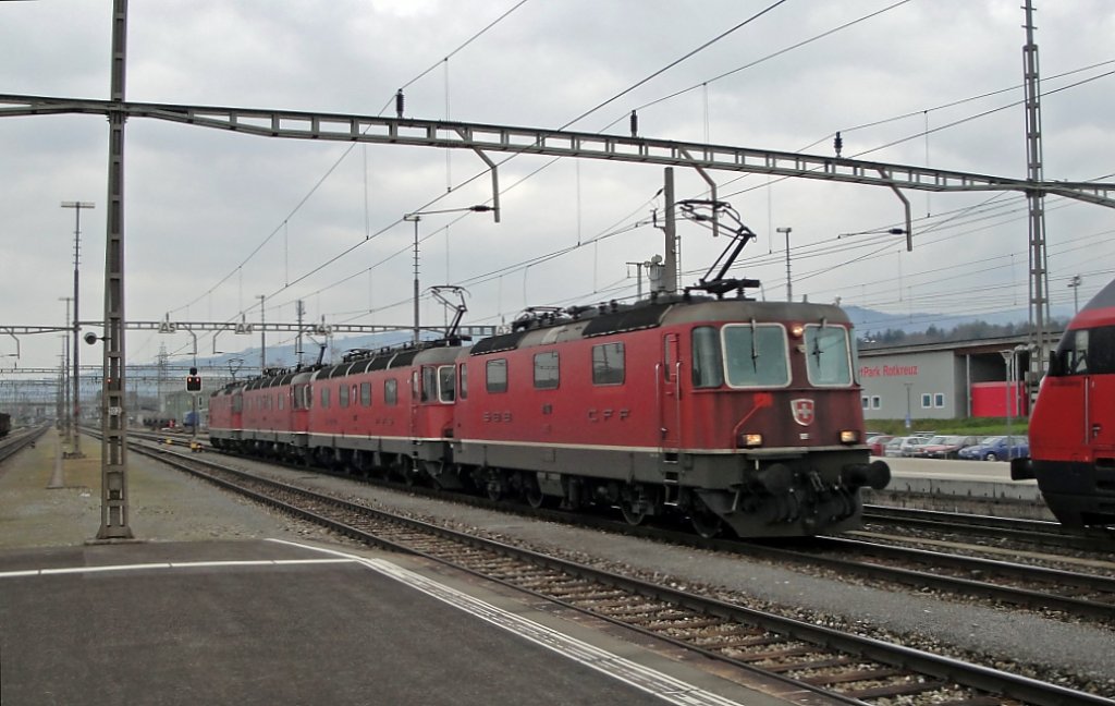 Loküberführung: Eine Re 20/20, angeführt von der Re 4/4" 11190, durchfährt am 15.04.10 den Bahnhof Rotkreuz. Die 11190 ist für ihren Frontenschmutz bekannt. (seit 2007 genau gleicher Anblick)