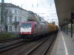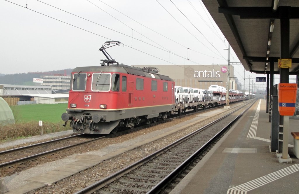 Die Re 4/4" 11348 hat am 09.04.10 in Lupfig "allerachsen" voll zu tun. Sie schiebt einen langen VW-Autotransportzug auf das entsprechende Abstellgleis.