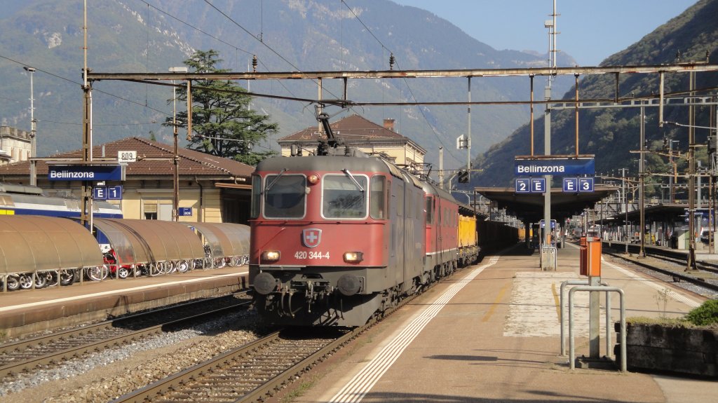 Das Re 10/10 Pack Re 420 344-4 + Re 6/6 11656 "Travers" durchfährt am 14.10.10 Bellinzona.