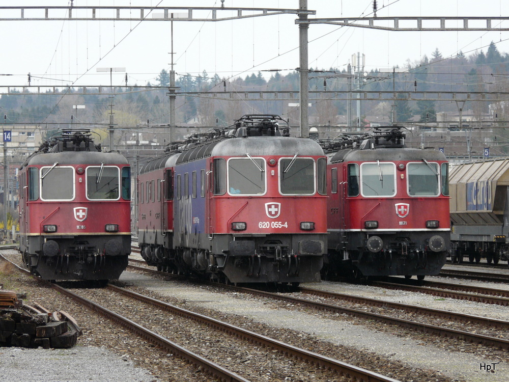 SBB - Re 4/4 11285 + Re 620 055-4 + Re 6/6 + Re 4/4 11171 im Güterbahnhof Biel am 26.03.2011